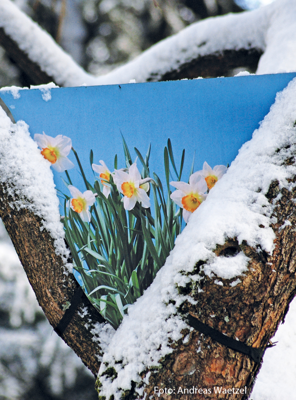 Etwa irritierend war sie bis zuletzt, die Blumenwiese oben im Geäst der Bäume. Die Kunst-Installation „Narzissenfeld“ der Freiburger Künstlerin Annette Merkenthaler. Seit mehr als sechs Jahren trotzten die Frühlingsblumen Wind und Wetter – nun sind sie verblasst und werden entfernt. Nicht der lange Winter und der zögerliche Beginn dieses Frühlings haben bewirkt, dass die Narzissen aus den Bäumen verschwinden (echte Narzissen gibt es im Gras am Boden weiterhin), sondern die Installation war von Anfang an auf eine begrenzte Zeitdauer ausgelegt.