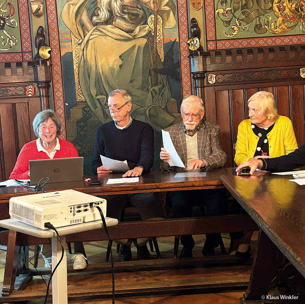 Gabriele Denz-Seibert, Klaus Winkler, Jürgen Bolder (v. r.) referierten am 29. September 2025 vor dem Breisgauer Geschichtsverein über das Leben von Karl Walterspiel, dem Gründer der Wiehremer Bürgervereine; links Renate Liessem-Breinlinger, die über den Neffen Alfred Walterspiel berichtete, einem berühmten Koch des 20. Jahrhunderts und Gründer des Hotels „Vier Jahreszeiten“ in München; zahlreiche Walterspielangehörige waren zu diesen Vorträgen auch von auswärts gekommen.